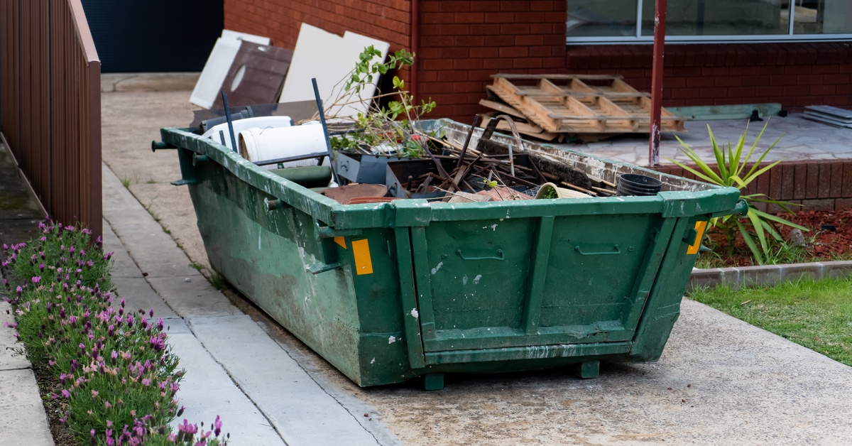 A large, green dumpster parked outside a brick home and filled to the brim with renovation debris and plants from outside.